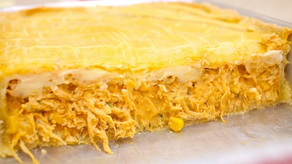 EMPADÃO SALGADO TRADICIONAL DE FRANGO. Empadão de frango cremoso com massa de creme de leite (macia e deliciosa), recheado com frango desfiado, azeitonas, milho e requeijão. Perfeito para um almoço ou jantar reconfortante.